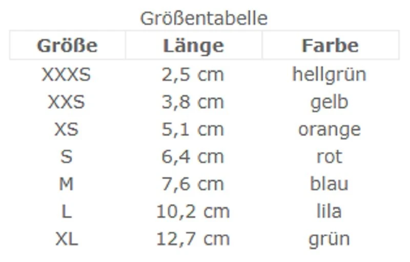 Den Verbandschutz Protex Pawz gibt es in sieben verschiedenen Größen von XXXS bis XL – jede von ihnen hat eine eigene Farbe, siehe Tabelle. Die PROTEX PAWS sind als Einwegschuhe konzipiert, in jeder Packung sind 12 Stück.